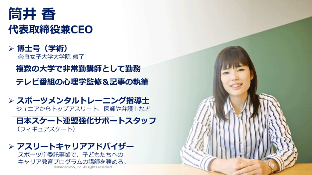 これら全プログラムを監修するのは、アスリートの心理サポートの専門家である(株)BorderLeSS代表取締役の筒井香。
